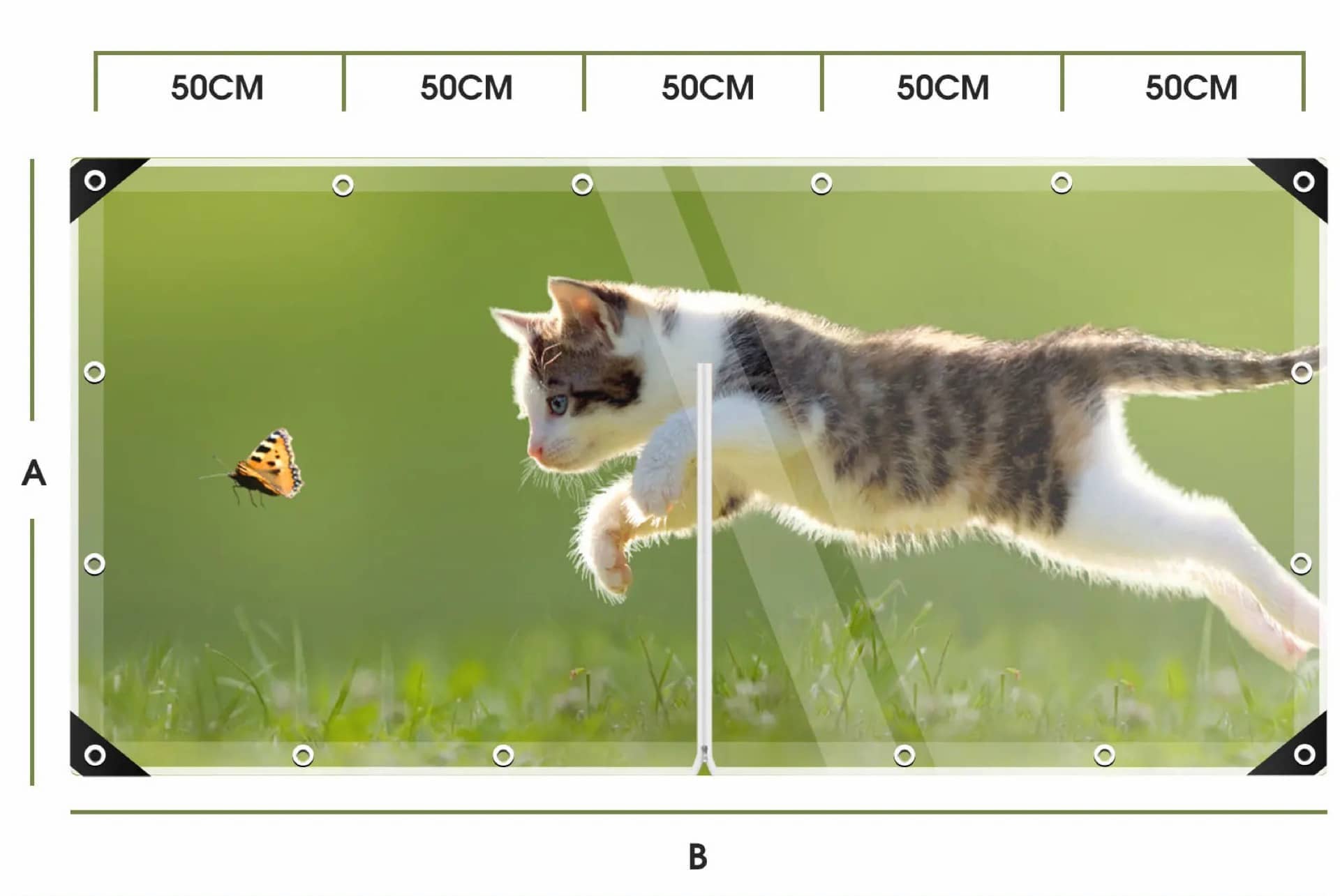 A ponyvákon a cipzár a “B” (hosszabb) oldal közepén található, és az “A” oldallal párhuzamos. (Kivéve a 2×2 és 3×3 ponyvákat.)
