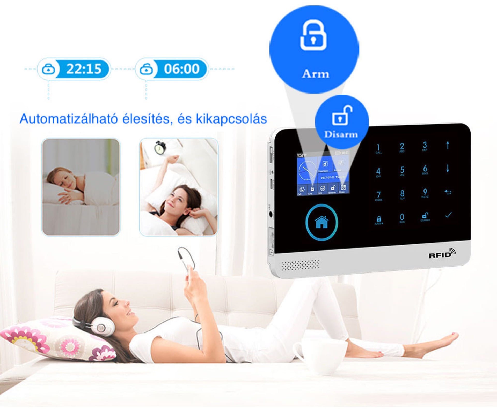 Riasztó ki-be kapcsolási lehetőségek: kód, applikáció, RFID, távirányító, SMS