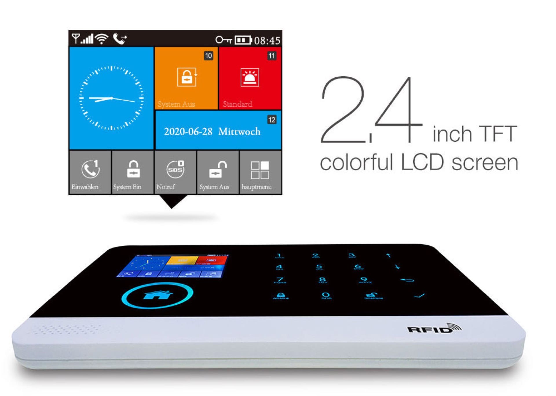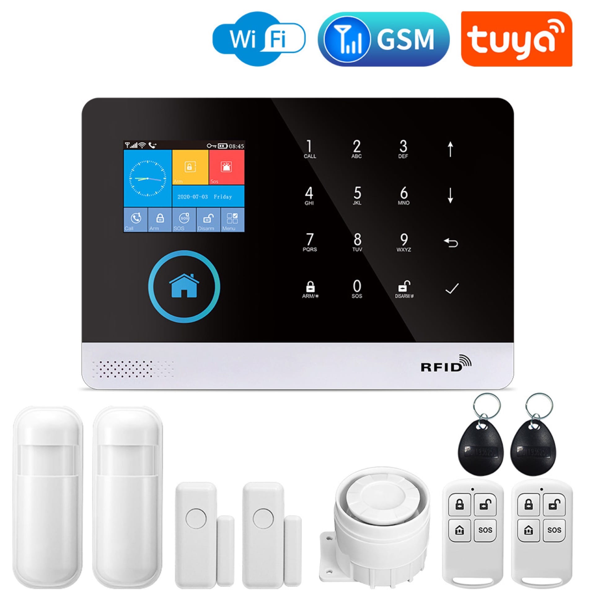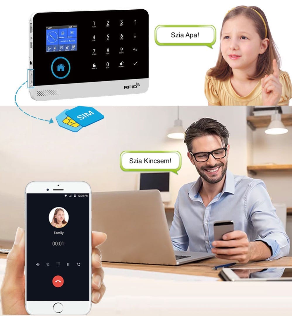 Csomag tartalma: riasztó főegység (főpanel), sziréna, PIR szenzor, nyitás szenzor, távirányító, RFID kulcstartó, tápkábel + adapter, használati és üzemeltetési útmutató.